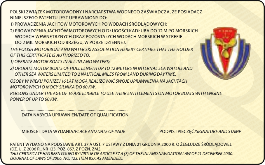 - prowadzenie łodzi motorowych o długości kadłuba do 12 m po morskich wodach wewnętrznych oraz pozostałych wodach morskich w strefie do 2Mm od brzegu, w porze dziennej